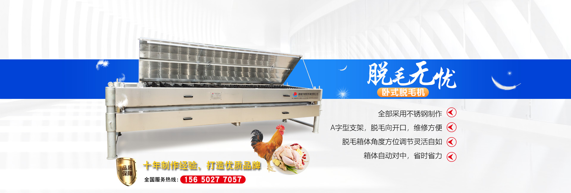 公司主要設備有:A字型立式脫毛機、臥式脫毛機、強力噴淋機、松毛機、浸燙池、螺旋預冷機、禽籠清洗機、電暈機、兔割前爪/后爪機、剝胗機、自動洗鉤機、螺旋燙爪機、雞爪脫皮機、分割輸送帶等屠宰用設備。